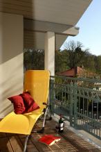 Dieser Balkon mit der gemütlichen Saunaliege dient zum Entspannen, Lesen und was immer Ihnen noch so einfällt.
